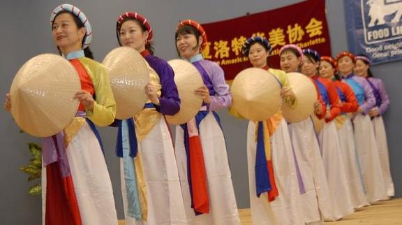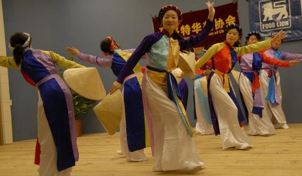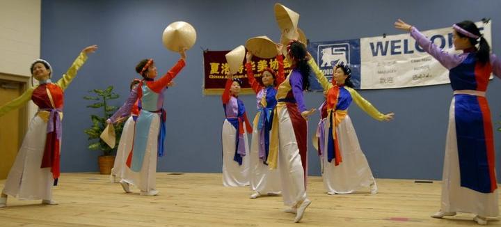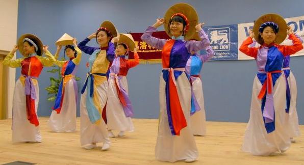 Description: A group of ladies, holding traditional straw hats, dancing along with a beautiful